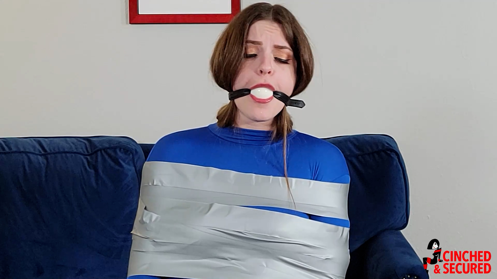 Poor Kat! She was caught and taped to a chair by a strange burglar with a fetish for body suits! After dressing her in a bright blue suit, he taped her up and stuffed a ball gag in her mouth and left her to struggle! Sadly, he soon decided she needed more tape, and before she knew it, her torso was absolutely welded to the frame of the chair! The good news? He seemed satisfied with his handiwork and left her bound and gagged and struggling. The bad news? He planned to return later!