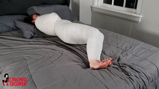 While vacationing in Italy, Cinched and MinxGrrl spied a young Italian beauty who they decided would make the perfect playmate. Alba, the object of their lust, had no idea that she was being stalked until the pair burst into her hotel room ! Clad in only a pair of tiny panties, she was no match for the couple, who quickly shoved a giant pliable ball into her mouth and taped it shut! Now, unable to cry out for help, the poor girl could only watch, wild eyed as the duo slowly began to wrap her sexy body in ultra tight, gleaming white bandages! She begged for them to let her go, but they ignored her mummified pleas. Once the bandages covered Alba's bare breasts, she knew escape was impossible! Soon she was completely cocooned in the unforgiving bandages, and worse still, the were constricting with every passing second! Alba squealed as the pair tossed her onto the bed! She thrashed and bucked in terror, but nothing she did allowed her to effect an escape! Her eyes were huge with terror when Cinched returned and wrapped her feet tightly, mashing them into one fused lump! Now, she was truly without hope! As she squirmed and mewled uselessly in her packaging, she could only wonder what would happen when (IF) they ever released her!