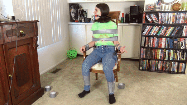 Claire has been very stressed at work, and all she wants to do is scream at the top of her lungs to relieve her frustration. Unfortunately, the walls of her apartment are paper thin and she doesn’t want to get in trouble by disturbing the neighbors. She tries everything to relax, including wearing her favorite raincoat, but nothing helps. Fortunately, a new service claims to be able to help and says it works like magic! A special helper arrives to help keep her quiet by stuffing a pair of socks into her mouth, sealing it shut with multiple strips of duct tape, then wrapping her head in medical bandage until only her eyes and nose are free! A few winds of electrical tape over her packed and sealed mouth complete the gagging process, and then she’s put into a nice tape hogtie to struggle, scream and work out her aggression. It works like a charm, but there’s only one problem: It really IS magic, and once the process begins, she finds herself progressively taped tighter and tighter and unable to stop it! Panicking, she fights like mad, struggling all over the floor as her hood is sealed shut and more and tape traps her already helpless body! Looks like the poor girl is going to have to wait for the spell to run its course!